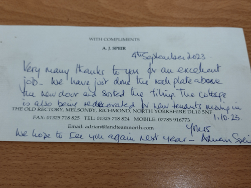 Very many thanks to you for an excellent job. We have just done the wall plate above the new door and sorted the fillup. The cottage is also being redecorated for the new tenements moving in. We hope to see you in the New Year.'